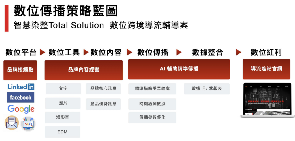 紡織業邁向智慧化、雲世代已是進行式,流亞從智慧製造出發,打造紡織矽谷,領航紡織雲世代,流亞對於紡織業智慧化轉型的貢獻功不可沒。這次與〈集客數據行銷 IBA〉、〈跨海通 LeadsGeek〉合作,採用數位行銷的方式,比以往僅靠參展及業務頻繁往來各國陌開的方式,能更快更無痛進入新的國家市場;是其他相似傳產、B2B 產業能借鏡效仿的方式。