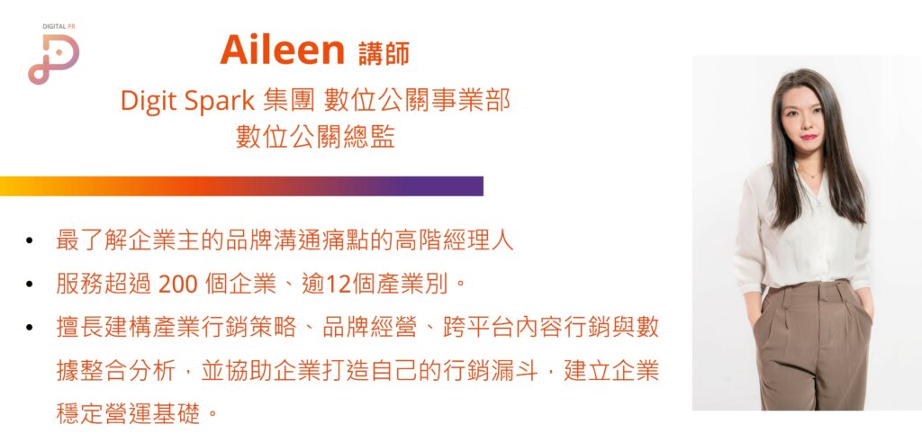 品牌行銷怎麼走進消費者心理,考驗企業的公關力,而一位專業的數位公關顧問,就是幫助各行各業的企業推手。在今天3小時的精華課程中,由Digit Spark團旗下—《Digital PR數位公關事業部》的公關總監的Aileen,講解什麼是數位公關、怎麼策劃公關行銷、以及公關如何發揮影響力;同時,也藉著機會邀請執行網紅與企業媒合行銷的Diaone公司,分享如何藉由KOL、KOC的影響力,讓消費者打從心底認同企業的品牌和產品。